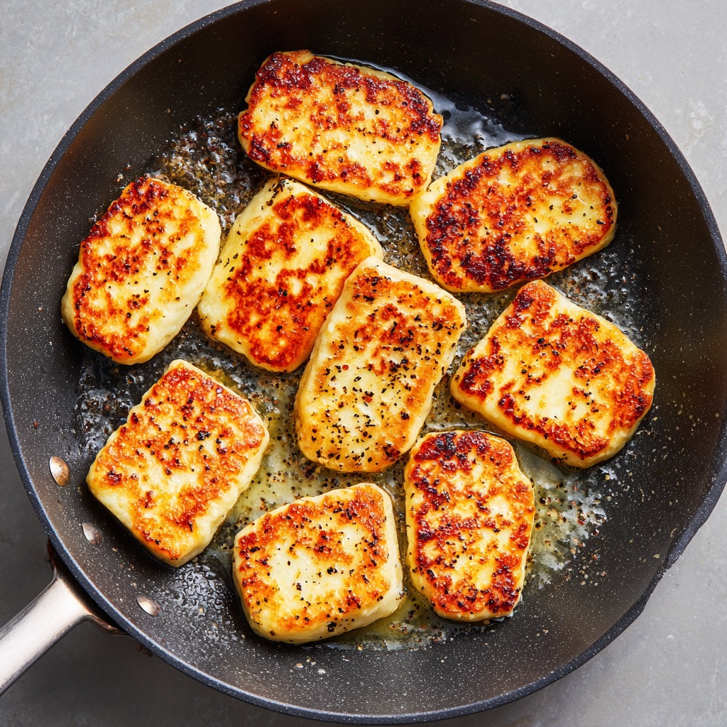 Pan-Fried Halloumi is a revelation in simplicity—a dish that transforms a single block of cheese into a golden, crispy, squeaky, and utterly addictive Mediterranean delight using just three ingredients and a hot skillet. This recipe is a celebration of halloumi’s unique qualities: its high melting point allows it to be pan-fried to a beautiful, shatteringly crisp crust while the interior becomes warm, soft, and delightfully squeaky. The magic begins with slicing the cheese into ½-inch slabs, then placing them in a hot pan with a touch of olive oil. In just a few minutes per side, the halloumi develops a deep, golden-brown crust that gives way to a warm, salty, milky interior. A final crack of freshly ground black pepper adds a subtle heat that perfectly complements the cheese’s natural saltiness.