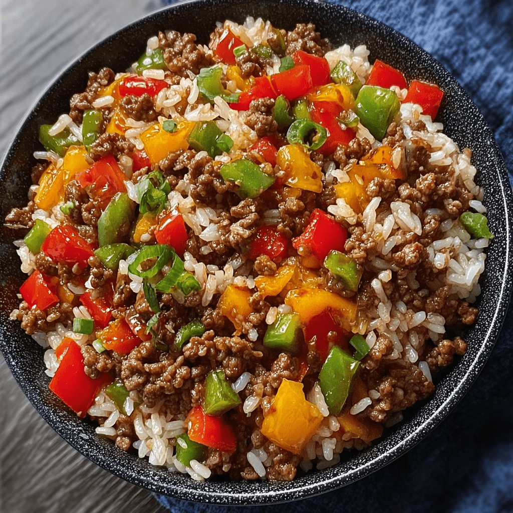 Remove the skillet from the heat. Spoon the hearty beef and pepper rice into bowls. Garnish with sliced green onions, a sprinkle of sesame seeds, or a drizzle of your favorite hot sauce for an extra kick. Serve immediately while hot.