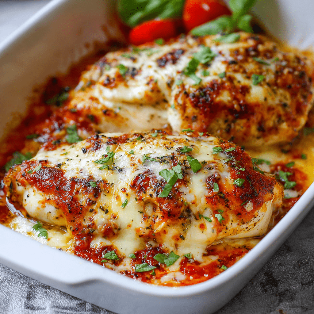 Cheesy Mozzarella Chicken Bake is the quintessential weeknight hero, a dish that masterfully combines simplicity with robust, crowd-pleasing flavors to create a comforting and complete meal with minimal effort. This recipe transforms basic chicken breasts into a juicy, savory, and indulgent centerpiece by layering them with vibrant marinara sauce and a generous blanket of melted, golden cheese. The process begins with a crucial step of searing the chicken, which not only locks in juices but also builds a flavorful, caramelized crust that adds a welcome depth to the final bake. Nestled in a dish and smothered with tangy marinara sauce, the chicken is then crowned with a blend of gooey mozzarella and sharp Parmesan, which melts into a bubbly, irresistible cheese cap as it bakes. The result is a harmonious blend of tender, well-seasoned chicken, zesty tomato sauce, and creamy, stretchy cheese in every forkful.