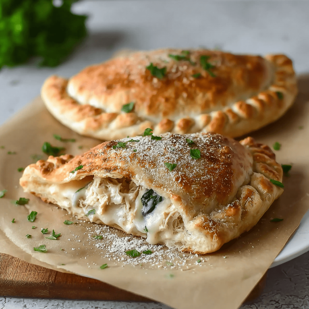 The Chicken Alfredo Calzone is a magnificent handheld feast, a brilliant Italian-American hybrid that ingeniously encases the creamy, luxurious flavors of a classic pasta dish within a golden, chewy, freshly baked pocket of pizza dough. This recipe masterfully transforms a simple ball of dough into a portable, self-contained meal, where each bite delivers the perfect ratio of tender, seasoned chicken, rich Alfredo sauce, and melty, stretchy cheeses. The genius lies in the folding technique: the generous mound of filling is carefully sealed inside its doughy envelope, which puffs and bakes into a sturdy yet tender crust that crisps beautifully under an egg wash. As it bakes, the steam trapped inside works its magic, melding the creamy Alfredo with the chicken and cheese into a cohesive, molten center that is decadent yet perfectly contained.
