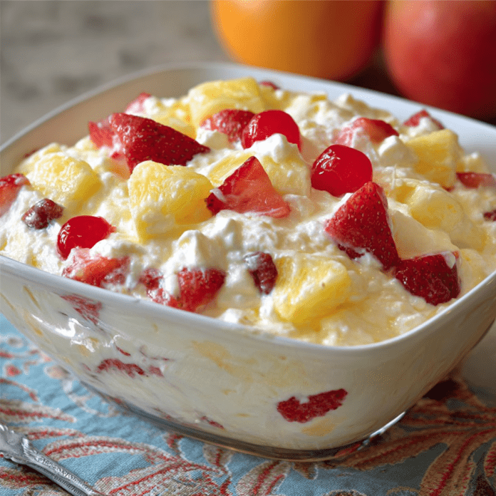Chilled Fruit Delight is a refreshingly retro dessert that masterfully combines the rich, tangy creaminess of a no-bake cheesecake with the vibrant, juicy burst of assorted fruits. This recipe is a celebration of texture and temperature, offering a cool, creamy, and impossibly light treat that is perfectly suited for warm summer days, potlucks, or as a bright finish to any heavy meal. The magic begins with a luxuriously smooth base of sweetened cream cheese, which is then lightened by the careful folding of freshly whipped cream, creating a cloud-like canvas that is both decadent and airy. Into this delicate base, a rainbow of fruits is incorporated: sweet crushed pineapple, tart and juicy strawberries, sunny mandarin oranges, and festive maraschino cherries, each contributing its own unique note to a harmonious symphony of flavors. The addition of crunchy pecans provides a delightful textural contrast, while a quick toss of banana slices in lemon juice ensures they remain bright and fresh within the frozen medley.