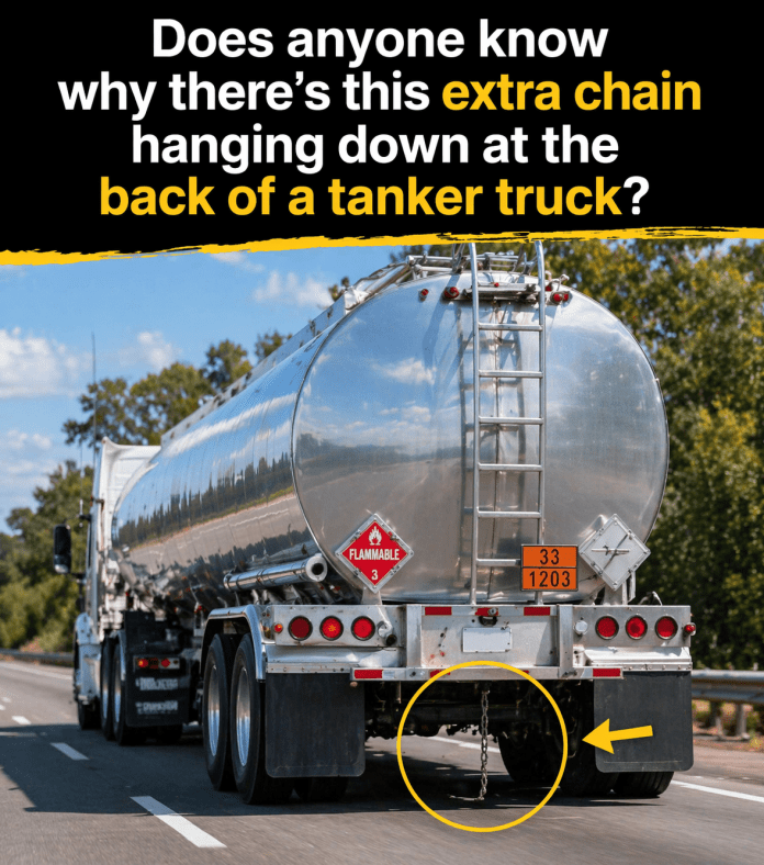 The extra chain hanging from the back of a tanker truck serves as a grounding device. Its primary purpose is to dissipate static electricity that can build up during the transportation of flammable liquids. As the truck moves, friction between the liquid and the tank, as well as the movement of the truck itself, can generate static electricity. If not properly managed, this static charge can lead to sparks, which pose a significant risk of igniting the flammable cargo. The chain drags along the ground, providing a path for the static electricity to safely discharge into the earth, thereby reducing the risk of fire or explosion.