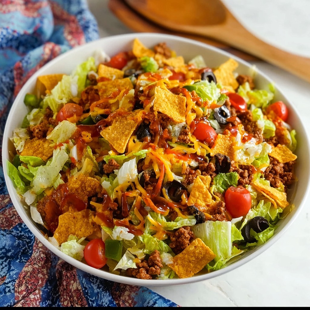 The brilliance of this salad lies in its strategic assembly and timing, ensuring maximum crunch and flavor in every forkful. By cooling the taco meat before adding it to the greens, you prevent wilting, preserving the lettuce’s refreshing crispness. The most critical rule is to add the crushed Doritos and dressing only immediately before serving, guaranteeing the chips maintain their signature crunch rather than dissolving into a soggy mass. This final toss transforms the bowl into a cohesive yet dynamic mixture where cool, crisp vegetables meet warm, savory beef and the loud, addictive crunch of the chips. It’s a dish that’s unapologetically fun, deeply satisfying, and engineered for crowd-pleasing success, delivering all the nostalgic joy of a fully-loaded taco in one spectacular, shareable bowl.