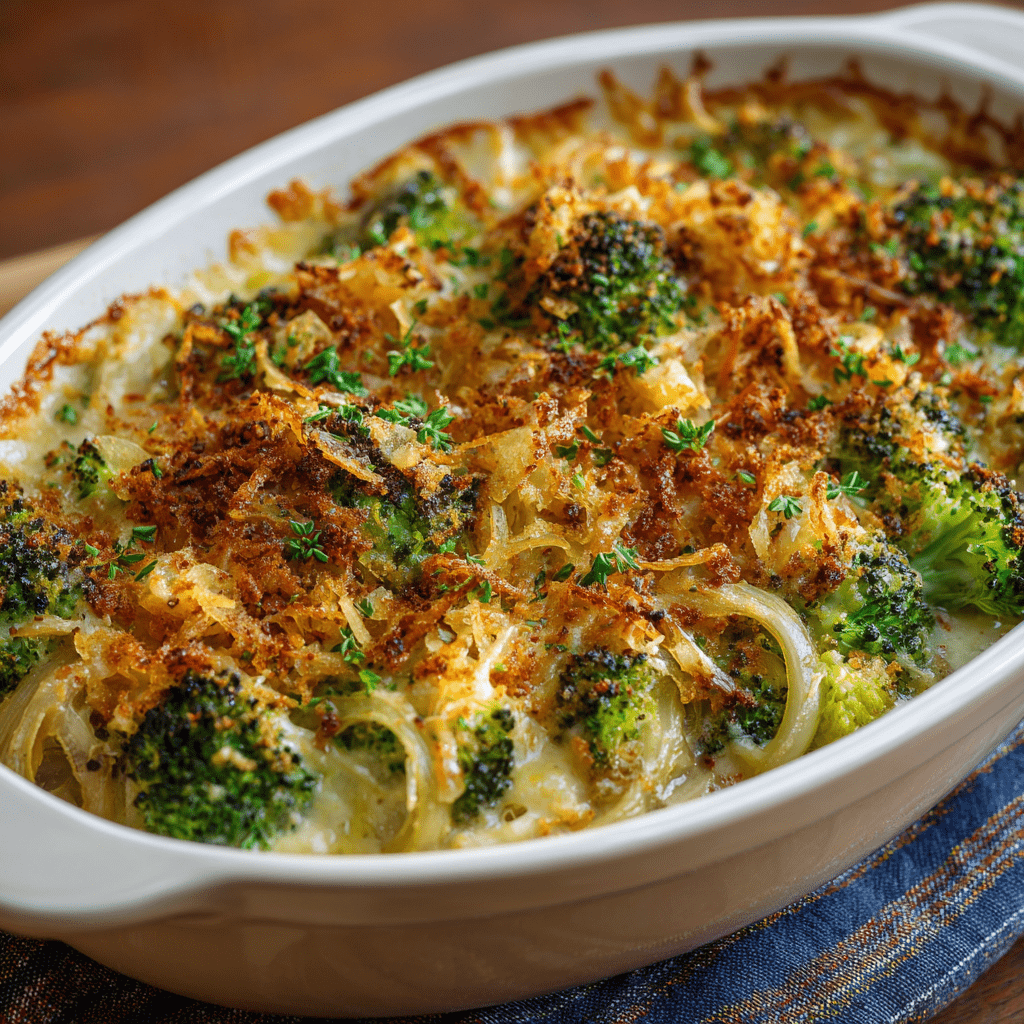 French Onion Broccoli Cheese Casserole is a sophisticated and deeply flavorful twist on the classic green vegetable casserole, masterfully marrying the rich, savory-sweet essence of French onion soup with the comforting, creamy goodness of broccoli and cheese. This recipe elevates humble ingredients into an elegant side dish or vegetarian main course by building layers of complex flavor. The journey begins with slowly caramelized onions, cooked low and slow with a pinch of sugar until they become meltingly soft, deeply golden, and intensely sweet, forming the soul of the dish. This aromatic base is then combined with bright, blanched broccoli florets and enveloped in a luxurious, from-scratch cheese sauce that is uniquely crafted with nutty Gruyère—the classic cheese for French onion soup—and sharp cheddar for a bold, tangy punch. The entire creation is crowned with a buttery, crisp panko breadcrumb topping that provides the perfect textural contrast to the creamy, savory filling beneath.