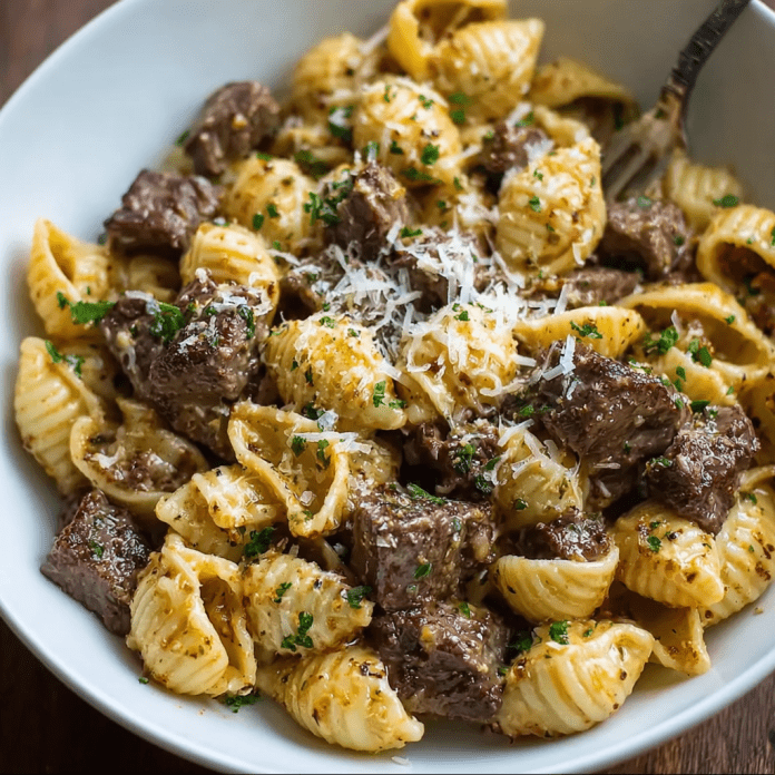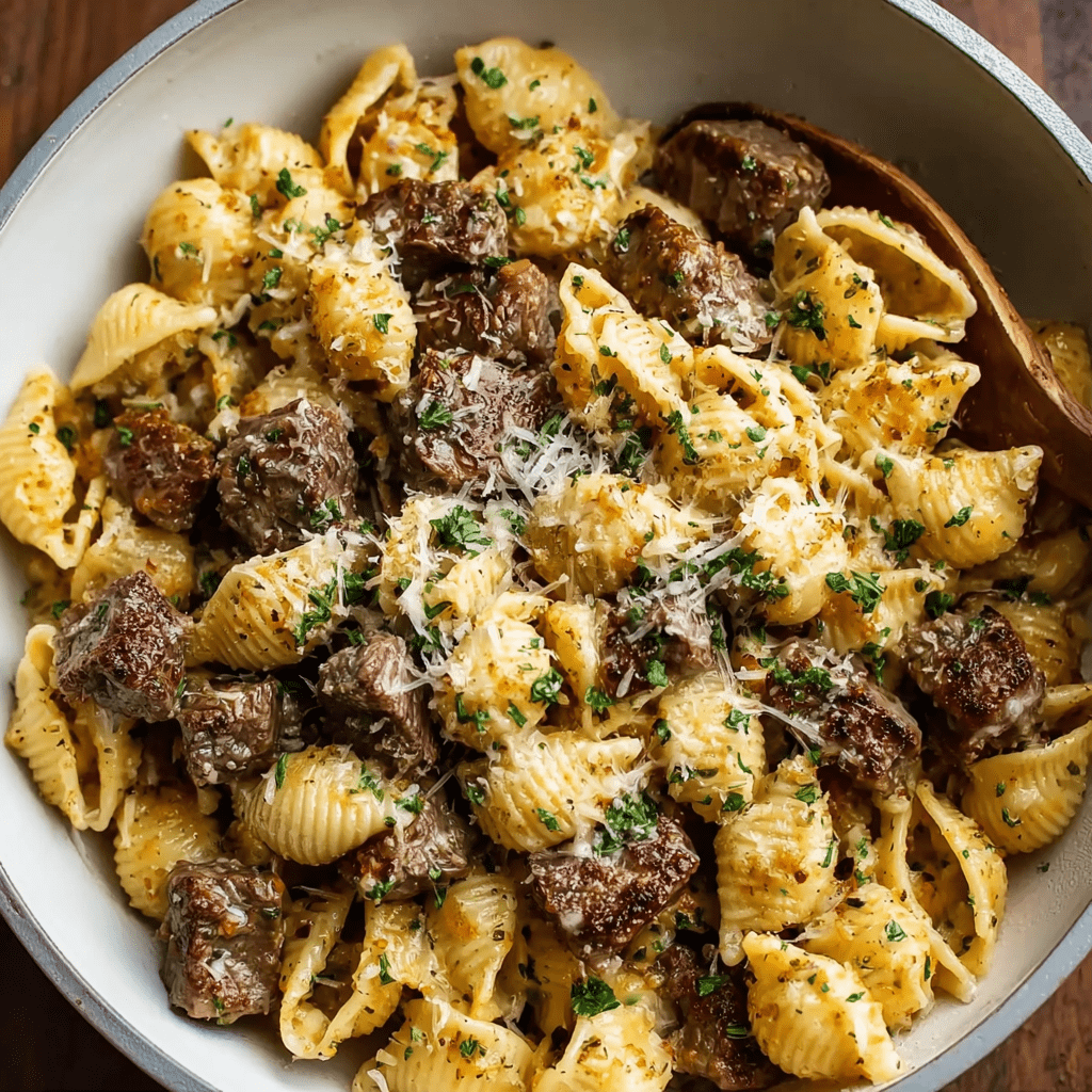 Garlic Butter Steak Bites & Creamy Parmesan Shells is the ultimate surf-and-turf-adjacent comfort feast—a luxurious, restaurant-quality meal that pairs tender, seared garlic butter steak bites with a velvety, rich Parmesan cream sauce enveloping tender pasta shells. This recipe is a celebration of bold, savory flavors and irresistible textures, where juicy, golden-brown cubes of sirloin or ribeye are cooked to perfection in a hot skillet, then tossed in a luscious garlic butter glaze. The magic continues with the creamy Parmesan shells: a simple yet elegant sauce made from butter, garlic, heavy cream, and freshly grated Parmesan, seasoned with a whisper of nutmeg and finished with a splash of reserved pasta water for silky perfection. Together, these two components create a meal that is deeply satisfying, surprisingly easy to execute, and guaranteed to impress.