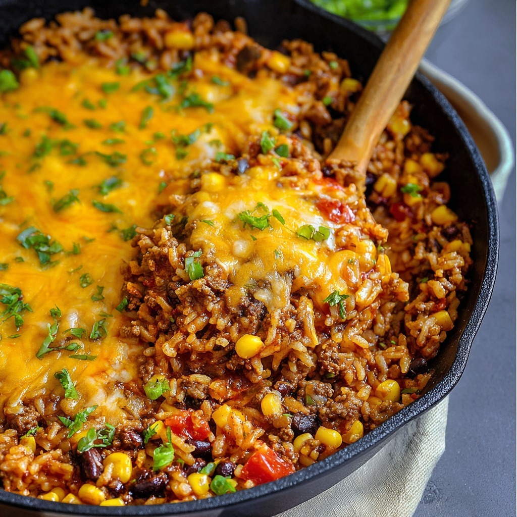 The brilliance of this casserole lies in its truly one-pot method and its incredible ability to please even the pickiest eaters. Everything cooks together in a single skillet, meaning deep, developed flavor and effortless cleanup. The use of taco seasoning, garlic powder, and salsa ensures a complex, authentic taste without a long list of individual spices. It’s a complete meal in itself—protein, starch, and vegetables all in one—but it’s also endlessly customizable. Top it with fresh cilantro, a dollop of sour cream, sliced jalapeños, or diced avocado for a fresh, cool contrast. This casserole is destined to become a regular in your dinner rotation: quick, comforting, and guaranteed to bring smiles to the table any night of the week.