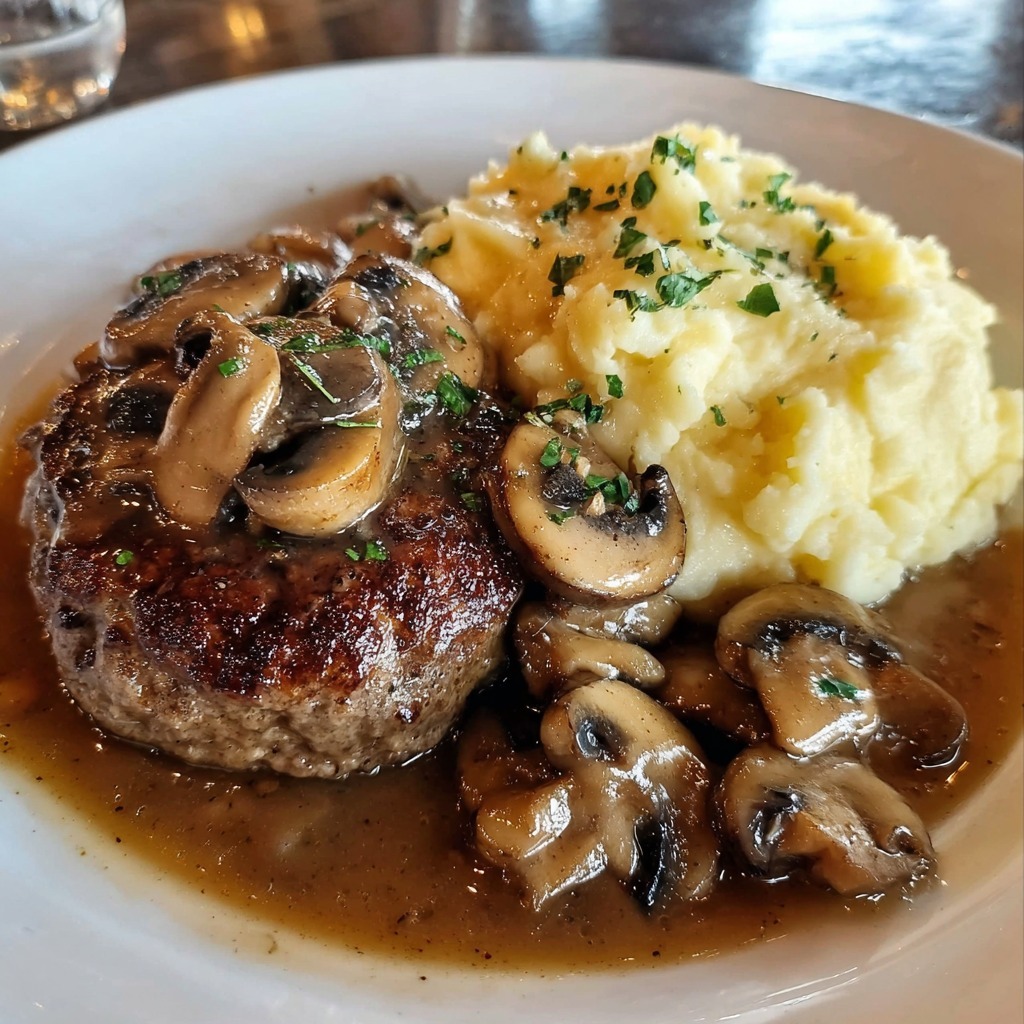 Salisbury Steak with Garlic Mashed Potatoes and Mushroom Onion Gravy is the ultimate homage to classic American diner comfort food, elevated to a nourishing, soul-satisfying homemade feast. This recipe masterfully transforms humble ground beef into succulent, flavor-packed patties, using a panade of breadcrumbs and grated onion to ensure they remain incredibly tender and juicy. The magic unfolds in a single skillet, where the seared patties leave behind a glorious fond—the browned, flavorful bits that become the foundation for a rich, velvety mushroom and onion gravy. This gravy is a masterclass in simplicity and depth, built by sautéing mushrooms in butter, creating a roux with flour right in the same pan, and deglazing with beef broth to capture every ounce of savory essence. The patties then finish cooking gently in this bubbling gravy, allowing them to absorb its deep, umami-rich flavors.