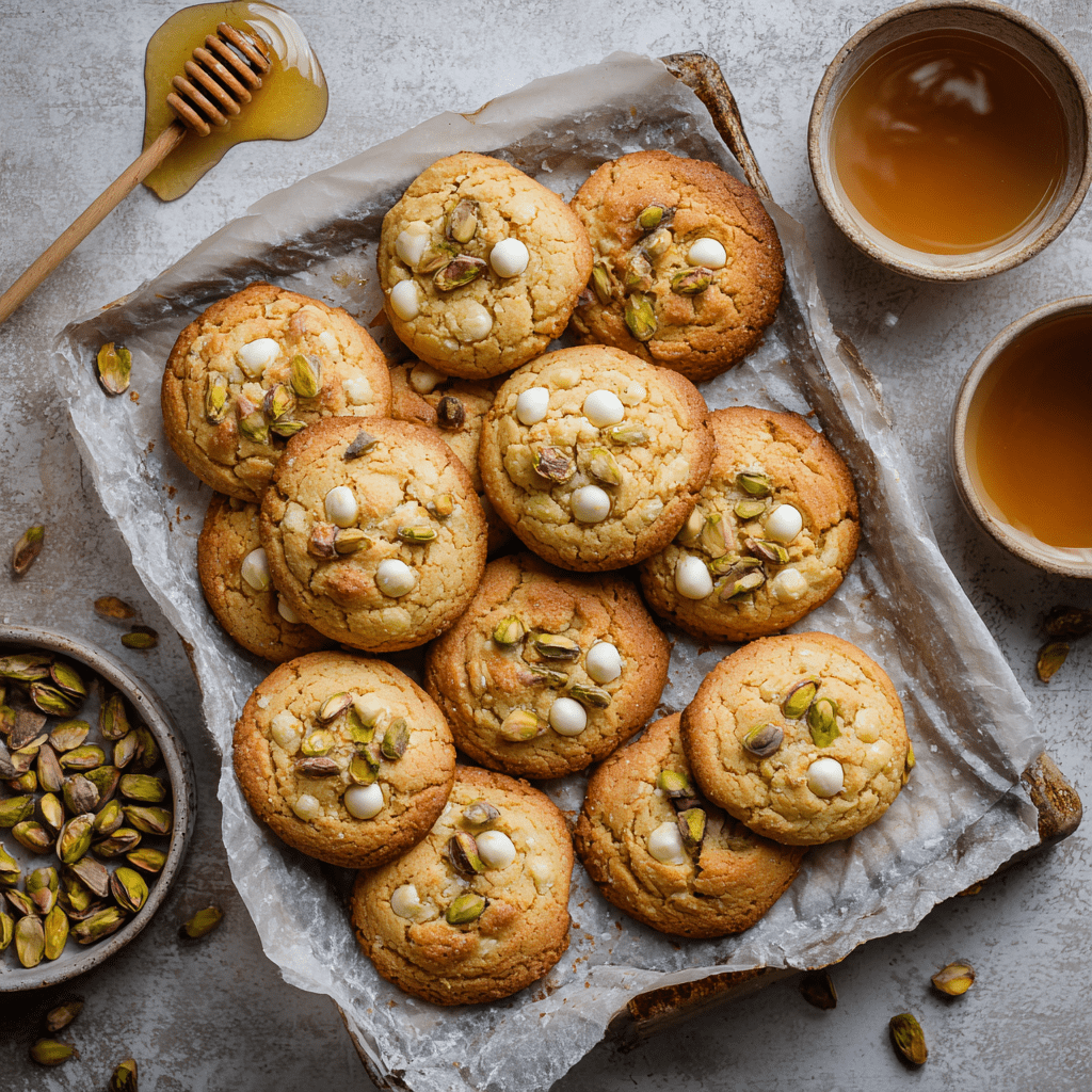 Salted Honey Pistachio Cookies are a sophisticated and unforgettable treat that elevates the classic chocolate chip cookie to new heights of flavor and texture. This recipe hinges on the deep, nutty complexity of brown butter, which forms a rich foundation that is beautifully complemented by the floral sweetness of honey and the savory crunch of roasted pistachios. The addition of white chocolate chips introduces creamy pockets of sweetness that balance the salty, nutty elements perfectly. Each cookie boasts a crisp edge that gives way to a wonderfully chewy center, a texture achieved by slightly underbaking them to preserve a soft, almost gooey interior. The final sprinkle of flaky sea salt just out of the oven is not merely a garnish but an essential component, heightening every other flavor and creating a truly addictive sweet-and-salty experience.