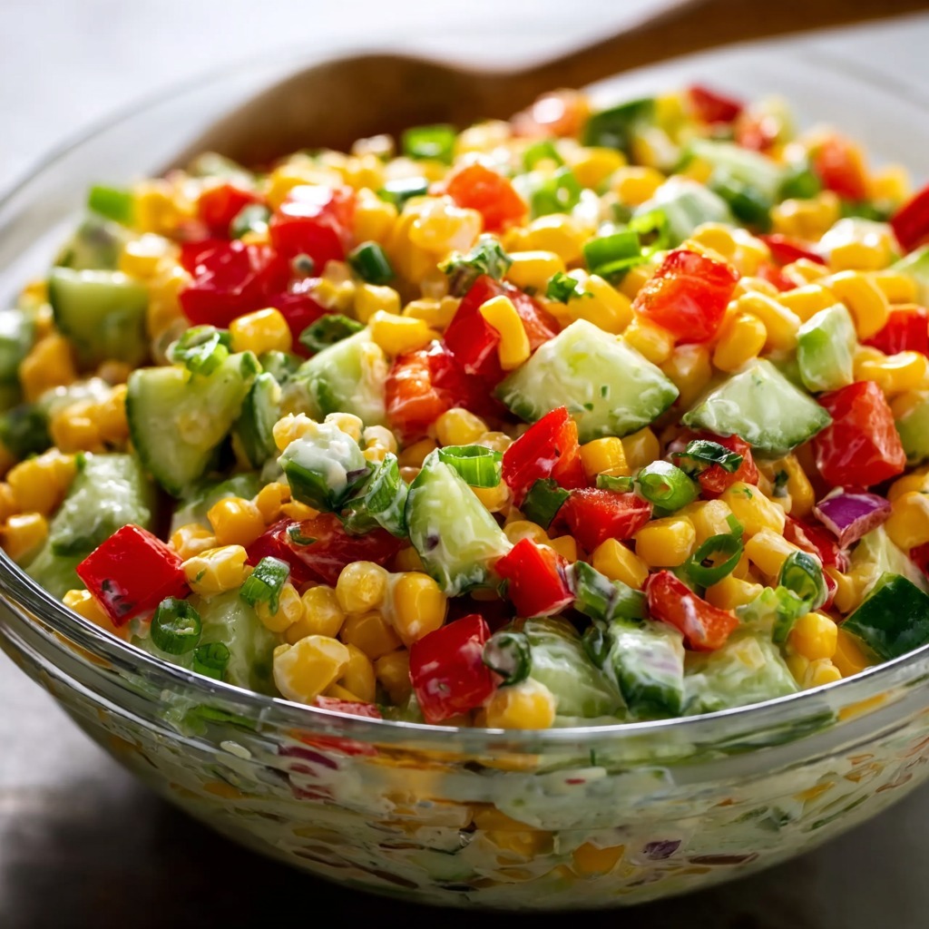 Shoepeg Salad is a quintessential summer side dish, a vibrant and refreshing celebration of garden-fresh vegetables bound together in a creamy, sweet-tart dressing that sings with simplicity and bright flavor. This recipe showcases the unique, petite kernels of white “shoepeg” corn—known for their tender crunch and delicate sweetness—as the star, surrounded by a confetti of crisp cucumber, juicy tomatoes, and colorful bell pepper. The magic lies in the harmony of textures and the effortless dressing, a minimalist blend of mayonnaise sharpened with a touch of white vinegar and just enough sugar to balance the acidity without overpowering the vegetables. Each ingredient is chosen for its ability to maintain integrity, resulting in a salad that is both visually stunning and satisfyingly crisp, even after a rest in the refrigerator.