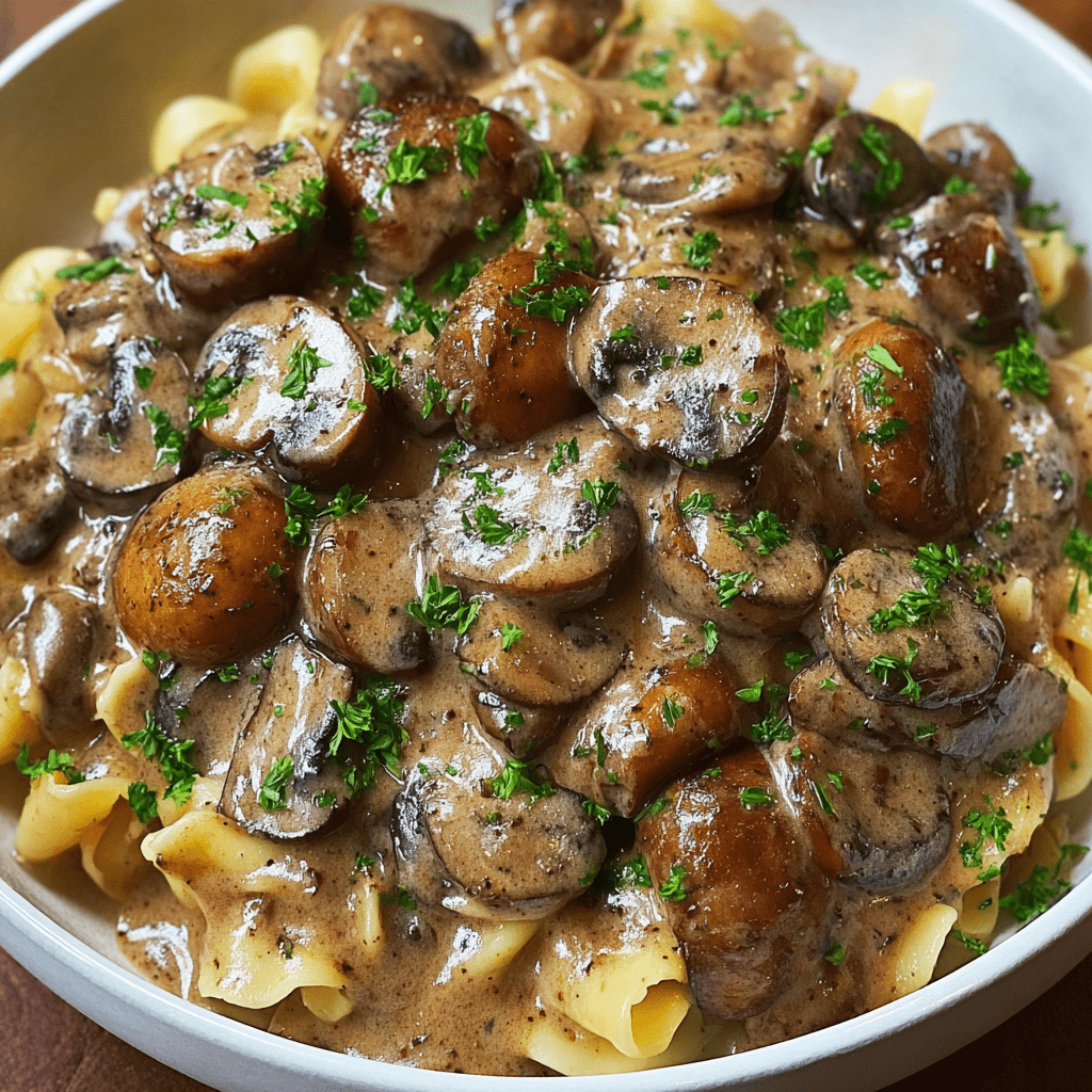 • Serve the creamy mushroom stroganoff over hot egg noodles or rice, garnished generously with fresh chopped parsley.