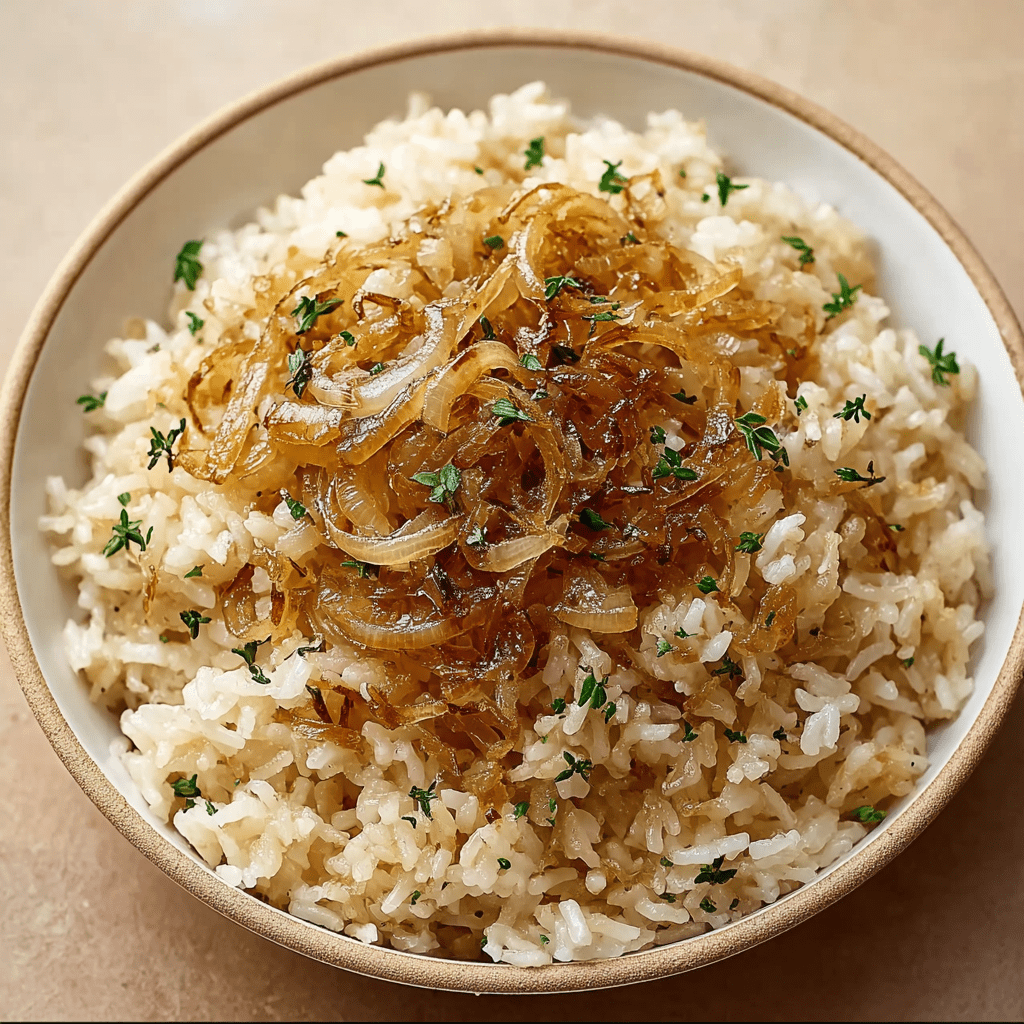 The genius of this recipe lies in its technique of building layers of flavor before the rice even begins to cook. By taking the time to properly caramelize the onions—a process that cannot be rushed—you develop a profound sweetness and umami depth that store-bought onion soup mixes can never replicate. Cooking the rice in the same broth used to deglaze the onion pan ensures that not a single drop of that precious flavor is lost. The result is a pot of rice that is perfectly fluffy, yet each grain is coated in the essence of onion, thyme, and butter. It’s a stunning side dish for holiday dinners, Sunday suppers, or any time you want a carbohydrate that truly stands on its own as a highlight of the meal.