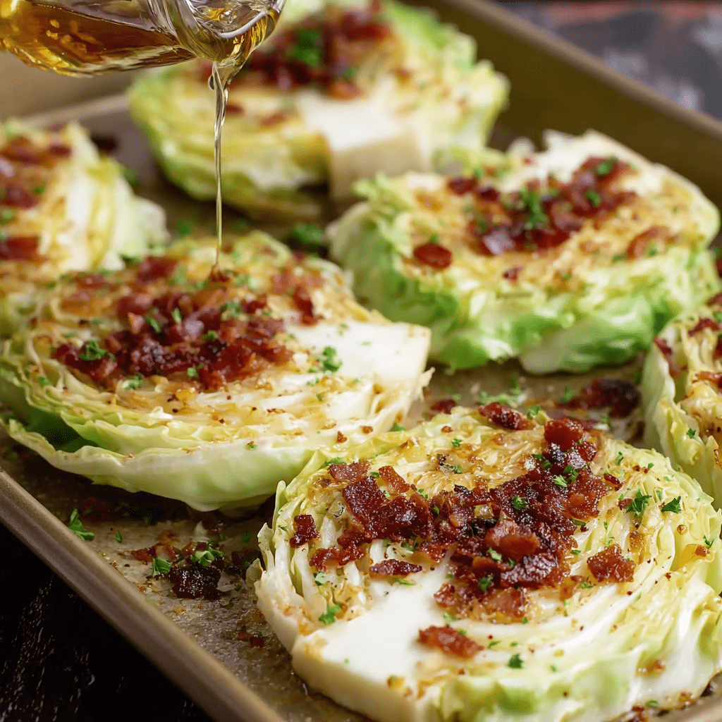 Southern Roasted Cabbage Steaks with Garlic Bacon Butter are a revelation—a stunning, deeply flavorful dish that transforms humble cabbage into a caramelized, savory, utterly irresistible centerpiece. This recipe is a celebration of Southern ingenuity, where thick slices of cabbage are roasted until the edges are beautifully charred and crispy while the interiors become tender and sweet, then lavished with a rich, smoky garlic bacon butter that seeps into every layer. The magic begins with slicing the cabbage into generous “steaks,” creating flat, sturdy rounds that hold their shape beautifully during roasting. A compound butter of melted butter, minced garlic, onion powder, smoked paprika, and crispy bacon bits is then spooned over each steak, working its way into the natural crevices of the cabbage. As it roasts at high heat, the butter melts and caramelizes, the bacon adds a salty, smoky crunch, and the cabbage transforms, developing a deep, nutty sweetness that is simply addictive.