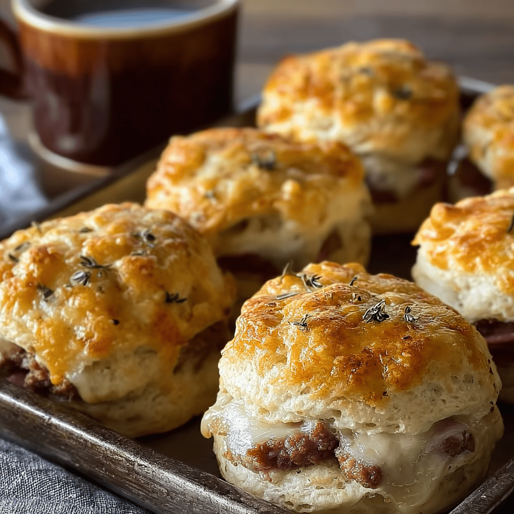 Southern Sausage Biscuits are a hearty, hand-held meal that masterfully combines the flaky, buttery comfort of a classic biscuit with a savory, juicy filling of seasoned roast beef and melted provolone cheese. This recipe cleverly uses refrigerated biscuit dough as a convenient and reliable base, which is stretched and wrapped around a generous stack of deli roast beef and a slice of provolone. The magic, however, lies in the deeply flavorful garlic-herb butter glaze that is brushed over the top before baking, infusing the biscuits with a rich, aromatic crust. Baked until golden brown and puffed, these biscuits are served with a simple side of warm beef broth for dipping, creating a comforting and satisfying experience that is reminiscent of a deconstructed, gourmet pot roast in biscuit form.