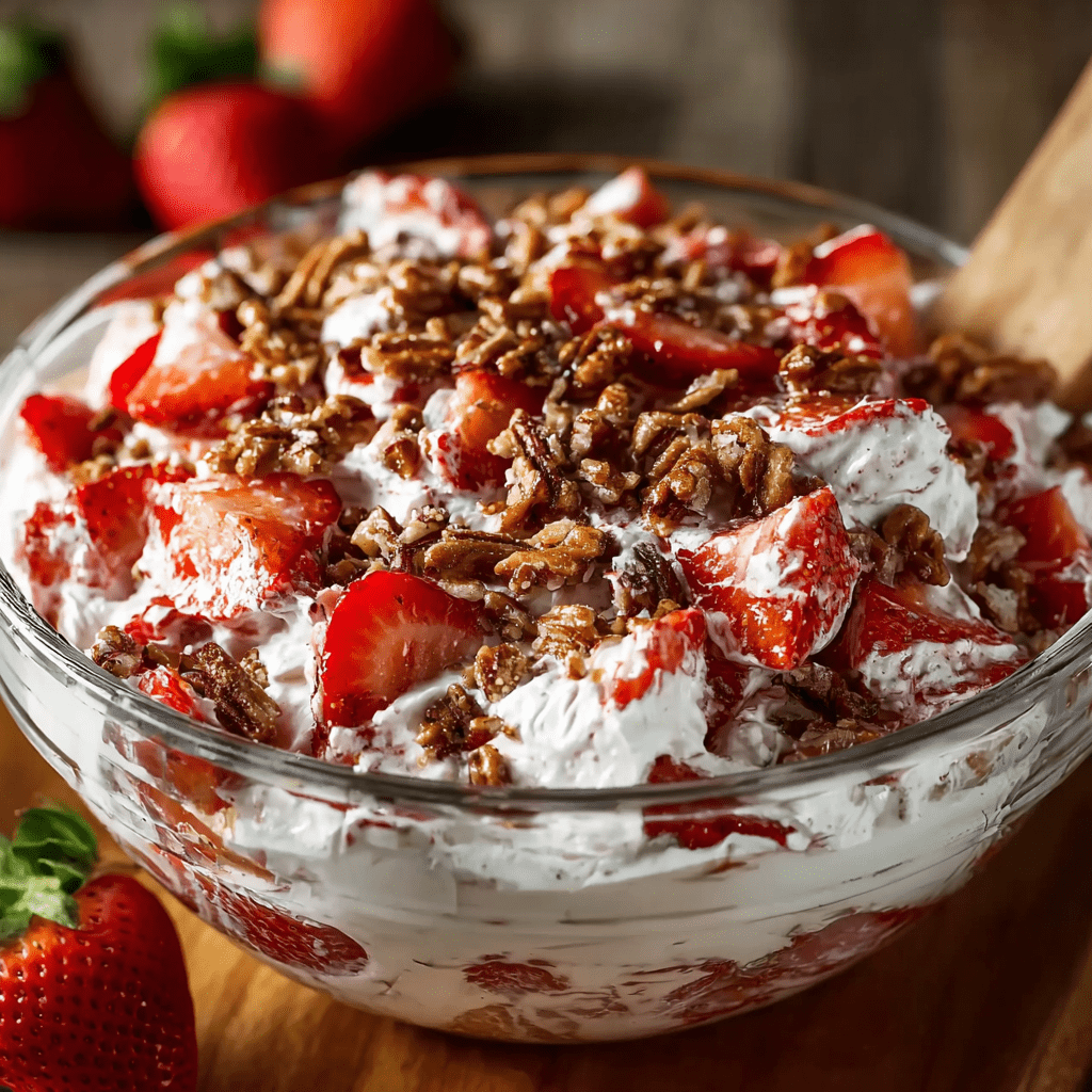 Strawberry Crackle Salad is a legendary dessert that defies simple categorization, a breathtakingly delicious concoction that masterfully combines sweet, salty, creamy, and crunchy elements into a show-stopping dish that is as fun to eat as it is to name. This recipe is a study in brilliant contrasts, built upon a foundation of a no-bake, fluffy cream cheese and whipped topping base that is impossibly light and sweet. Into this cloud-like canvas, ripe, juicy sliced strawberries are folded, providing a burst of fresh, tart fruitiness that cuts through the richness. However, the true star and the source of the “crackle” is the phenomenal baked pretzel and pecan crunch. A mixture of crushed pretzels, chopped pecans, and brown sugar is bound with melted butter and baked until caramelized, creating clusters that are at once salty, sweet, buttery, and addictively crisp. When this crunch is layered with the creamy strawberry filling, it creates a textural symphony that is utterly irresistible and keeps you coming back for another bite.