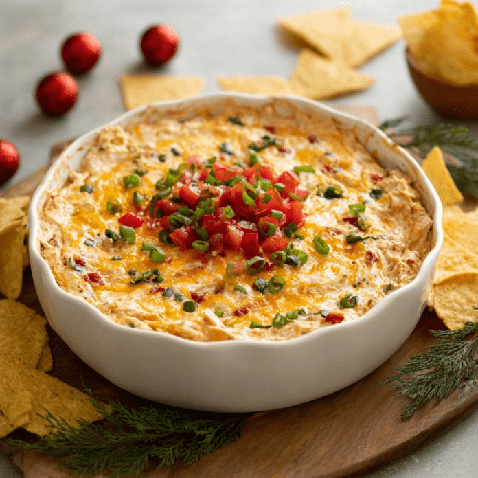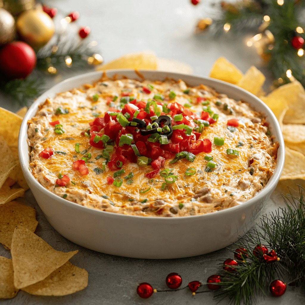 Texas Christmas Dip is a vibrant, hearty, and irresistibly festive party appetizer that brings the bold, Tex-Mex flavors of the Southwest straight to your holiday table in a warm, creamy, and crowd-pleasing format. This recipe is a celebration of layered textures and tastes, starting with a rich and tangy base of cream cheese and sour cream, powerfully seasoned with a packet of taco seasoning for an instant punch of chili, cumin, and garlic. This creamy foundation is then blended with smooth refried beans, mild diced green chiles, and chunky salsa, creating a thick, flavorful, and cohesive dip that bakes into a bubbly, golden-topped masterpiece. The final flourish of fresh, cool toppings—diced tomatoes, crisp green onions, and briny black olives—provides the perfect “Christmas” color contrast and a refreshing crunch that cuts through the rich, savory warmth of the baked dip, making every scoop with a sturdy tortilla chip a perfect bite.